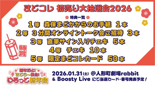 特典獲得者は、2026年1月31日(土)『人形町劇場rabbit』(東京都)で開催いたします「新年だよ!まどらー集合!ゆるっと新年会」およびBoosty LIVEの生配信にて発表予定です。