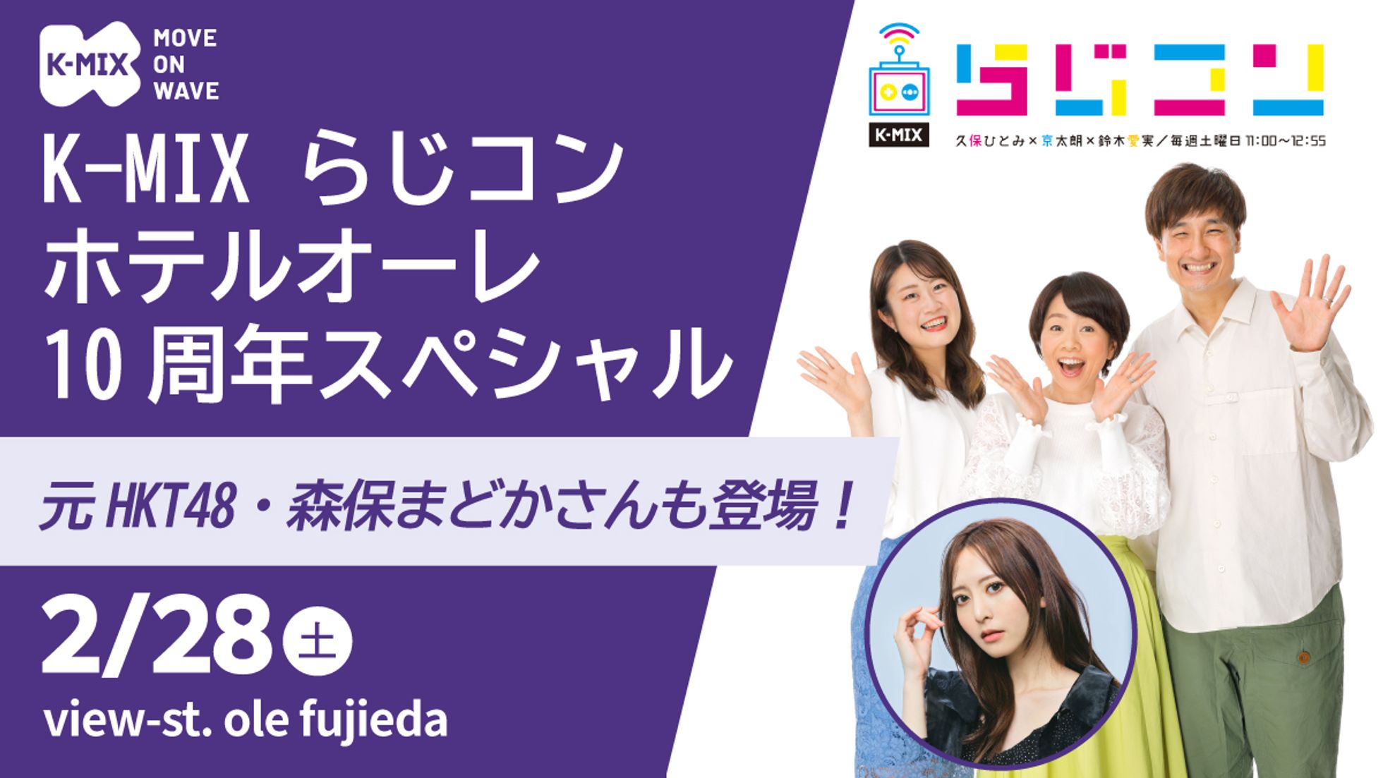 2月28日(土)11:00〜K-MIX「らじこん ホテルオーレ10周年スペシャル」公開生放送は、事前申し込みや抽選はございません。観覧をご希望の方は、ホテルオーレ3F K-MIXスタジオ「view-st. ole fujieda」までお集まり下さい✨